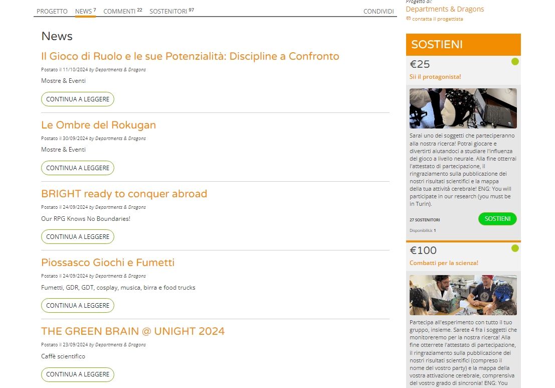 Ogni news può contenere testi, immagini e video, e ha un link autonomo rispetto a quello principale della campagna in modo tale da poter essere condivisa autonomamente su ogni canale di comunicazione. Allo stesso tempo il layout delle news è sviluppato per offrire comunque ai lettori l’opportunità di scegliere una ricompensa e supportare economicamente un progetto; in questo modo le news sono ottimizzate per convertire il pubblico in sostenitori mentre la campagna è attiva.