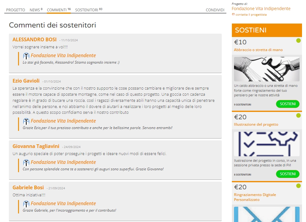 Ma uno strumento alternativo per coltivare la relazione con i sostenitori è anche l’area commenti di ogni campagna, uno spazio che racchiude i commenti pubblicati da tutte le persone che hanno già sostenuto un progetto e a cui i progettisti possono rispondere direttamente dal loro profilo su Ideaginger.it.